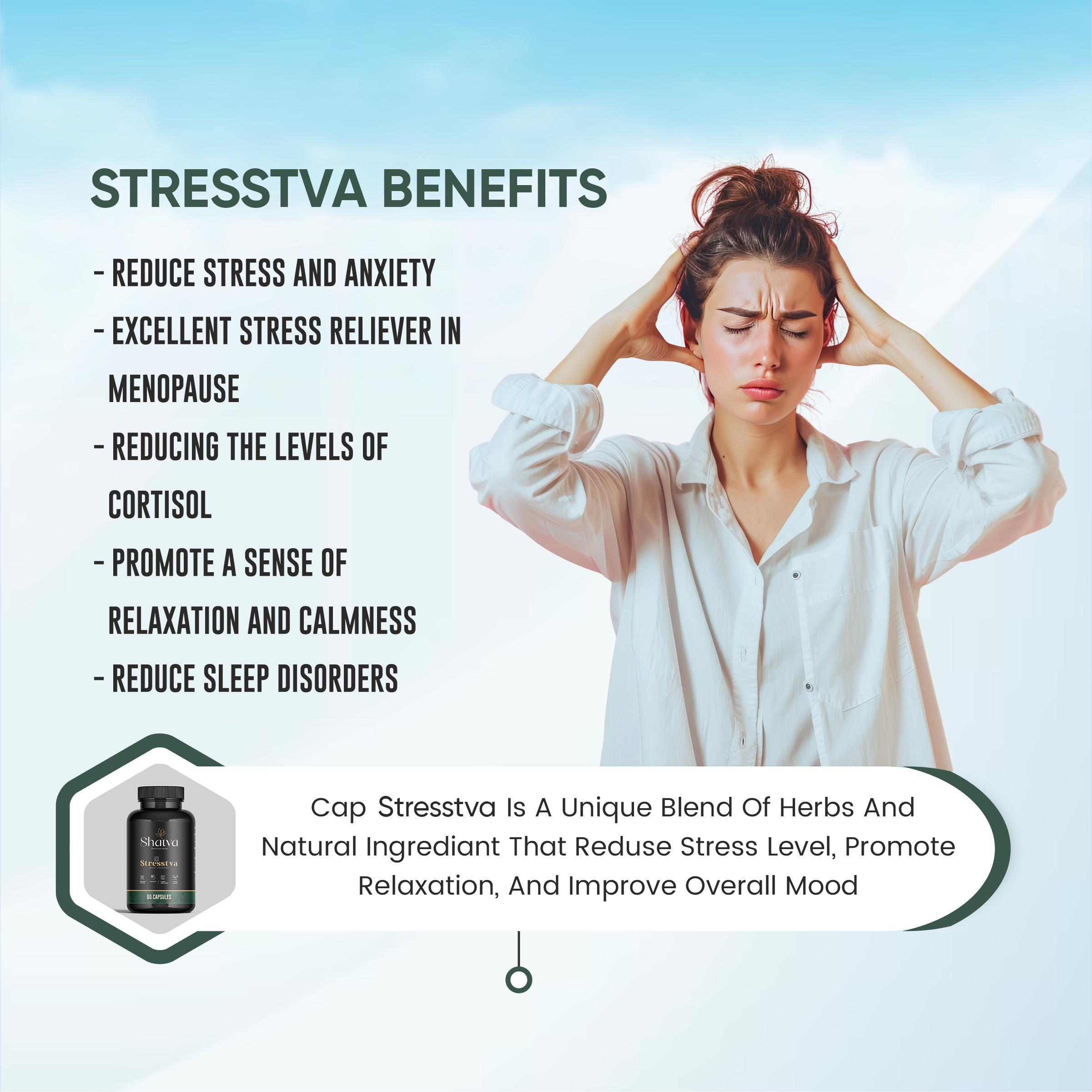 Stresstva is a natural and non-addictive formulation that effectively addresses an imbalance in Vata dosha, which is one of the major causes of sleeplessness. By doing so, Stresstva helps initiate sleep at your desired bedtime, promoting deeper and more restful sleep, allowing you to drift off naturally and wake up feeling refreshed and rejuvenated each morning. This non-hormonal solution naturally enhances melatonin production in the brain, activates melatonin receptors, and aids in synchronizing your body's circadian rhythms, ultimately making falling asleep easier due to a heightened sense of sleepiness.